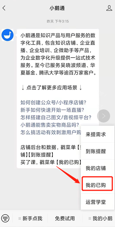 ①点击微信通讯录右上角+号,选择公众号搜索【小鹅通】→点击菜单栏“我的小鹅”→“我的已购”