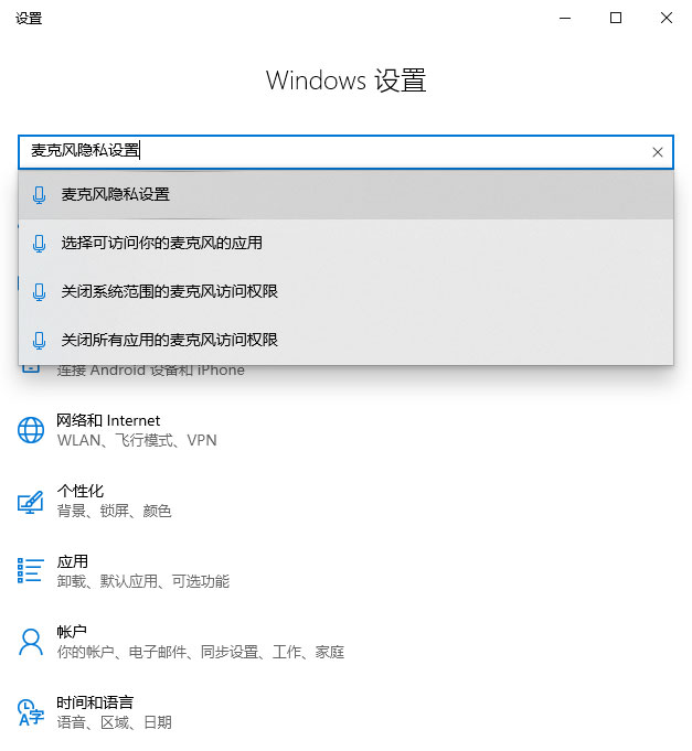 按下win+i打开设置,搜索麦克风隐私设置。