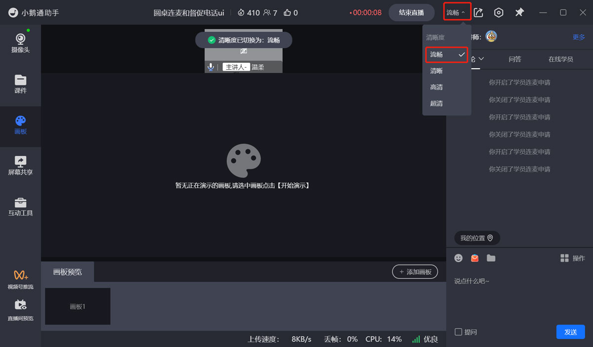 2、小鹅通助手:找到直播清晰度设置,将清晰度和码率调整至流畅,进行推流后即可降低直播流量消耗(注意:清晰度越低可能会影响直播画面效果)