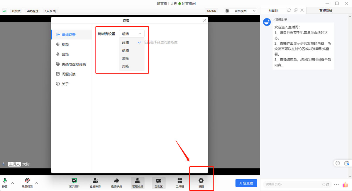 1、鹅直播客户端:在直播间内找到【设置】-【常规设置】,将清晰度和码率调整至流畅,进行推流后即可降低直播流量消耗(注意:清晰度越低可能会影响直播画面效果)