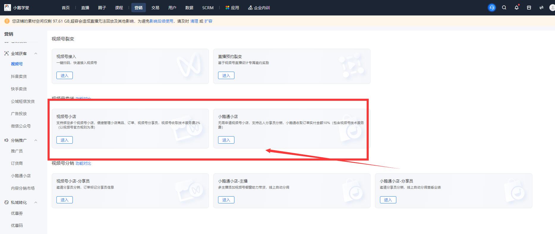 如果用户已经开通视频号小店,可以通过小鹅通管理后台营销-视频号-视频号卖货-视频号小店,去授权绑定自己的视频号小店。