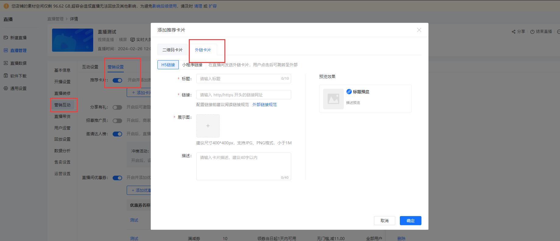 首先,小鹅通商家用户登陆小鹅通店铺,找到创建好的直播间,点击直播管理-营销互动-营销设置,开启推荐卡片,选择外链卡片,将外部链接或者小程序链接设置好,直播的时候,讲师或者助教老师可以将这个链接弹出到直播间,方便商家引导用户进入自己的交付平台去交付。
