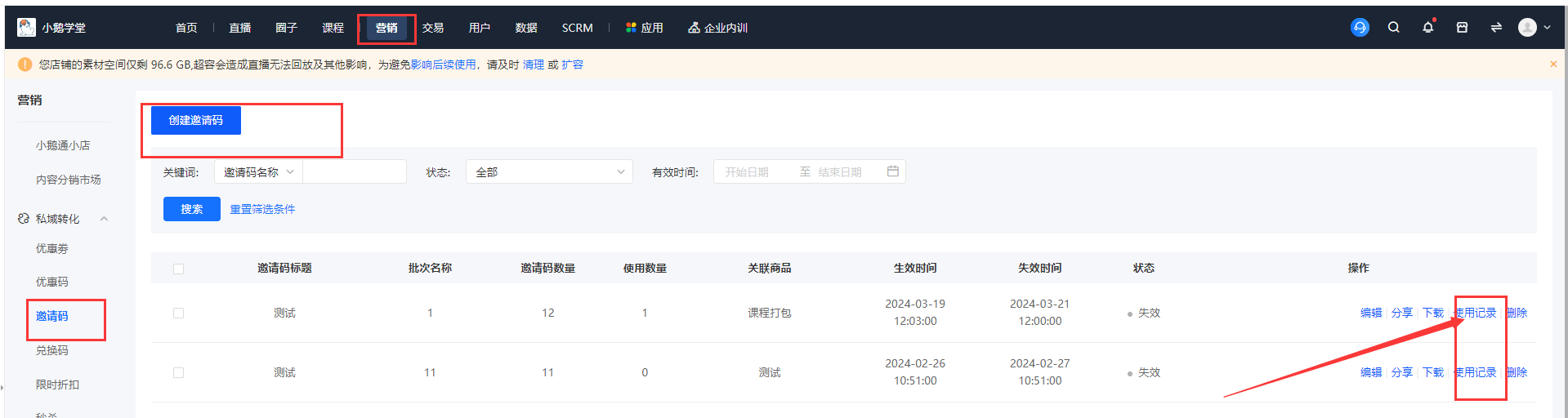 方式二:小鹅通商家用户在小鹅通店铺后台,找到营销-邀请码-创建邀请码,这个邀请码兑换要授权的课程,创建好邀请码之后,点击邀请码后面的“使用记录”,获取邀请链接发给学员,学员点击这个邀请链接就可以免费兑换这个课程了