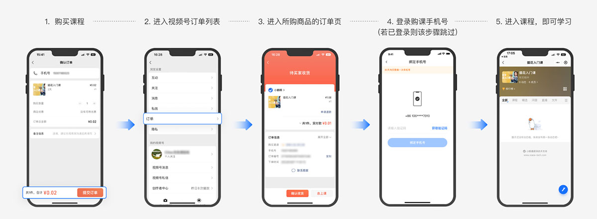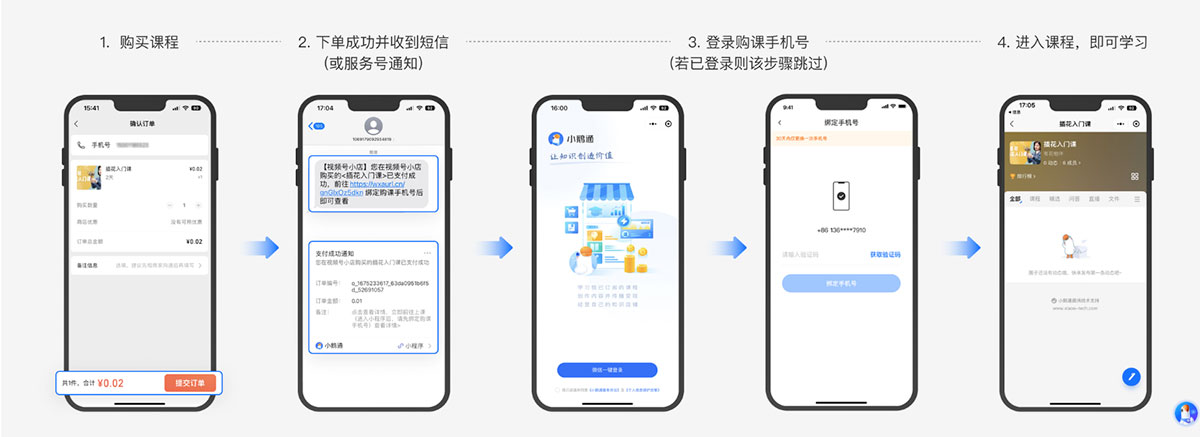 收到发货短信>点击短信中的看课链接>自动跳转“小鹅通”小程序>绑定购课手机号(如已绑定则跳过)>自动打开已购课程