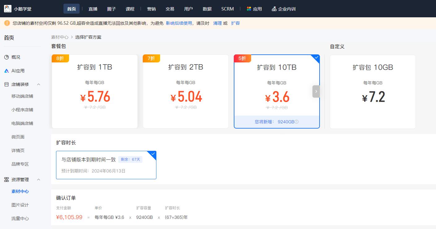 二、小鹅通商家用户也可以进入“首页”——“素材中心”,右上角“扩容”,将店铺空间增加,下面是扩容店铺空间费用