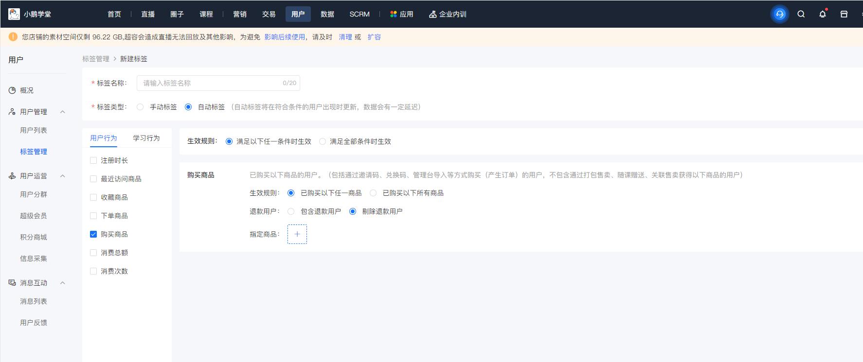 小鹅通商家用户怎么给自己店铺里面购买指定商品的用户确定打标签,方便后期用户管理?