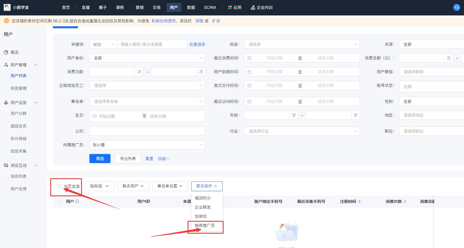 小鹅通商家用户可以登陆小鹅通店铺管理后台,找到“用户”——“用户列表”,在用户列表条件筛选的地方选择所属推广员,筛选出来这个推广员下面的所有客户,然后全选这个推广员下面的所有客户,点击“更多操作”里面的换绑推广员就可以了。