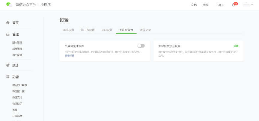 第一步:进入【微信小程序后台】,点击“设置”-“关注公众号”进入【关注公众号设置页面】, 开启“公众号关注组件”,并选择希望展示的公众号(该公众号必须与小程序主体一致)。根据微信官方要求,在小程序内仅支持展示和小程序主体一致的公众号组件。