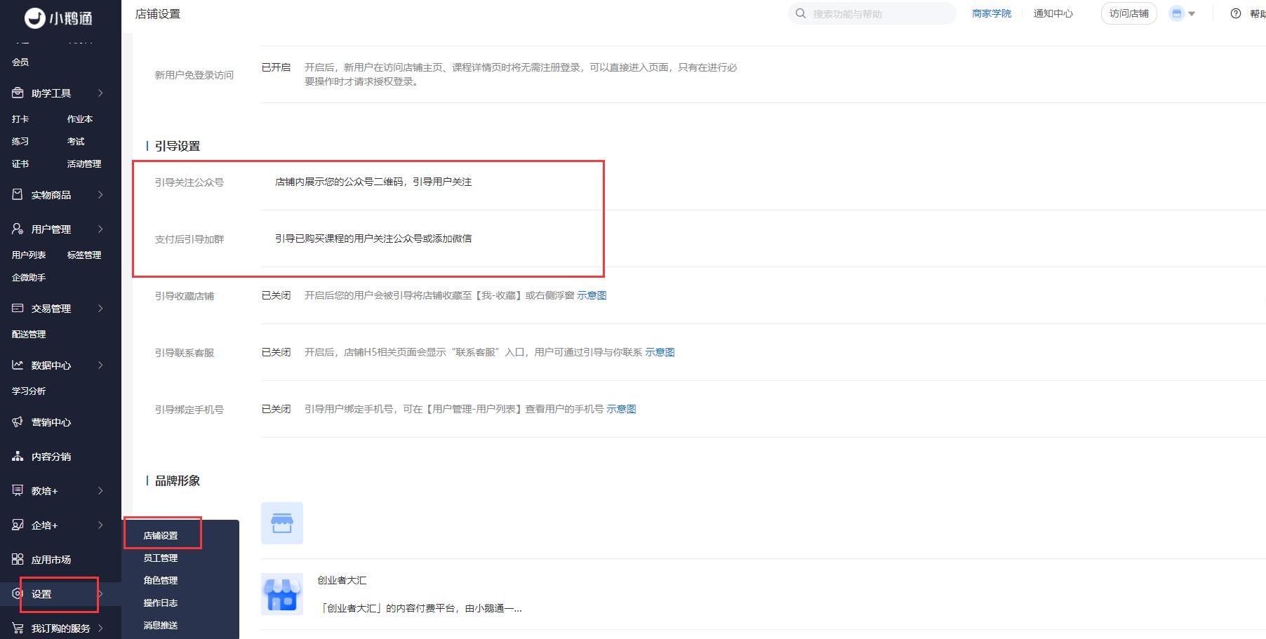 进入店铺管理后台,点击【设置】-【店铺设置】,找到【支付后引导加群】设置;