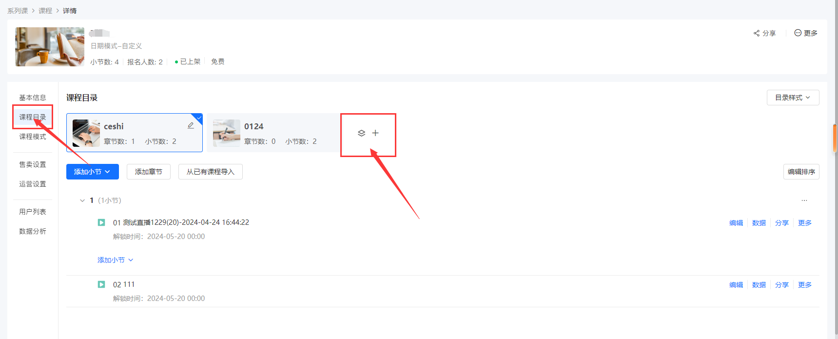 3、再创建的系列课里面,找到课程目录里面可以添加”子课程“,再对应的子课程下方又可以添加每个子课程下方的章节和小节课程,这样就用户进入这个系列课就可以看到多个子课程下方的课程了,就实现了一个大系列课里面包含多个小系列课。