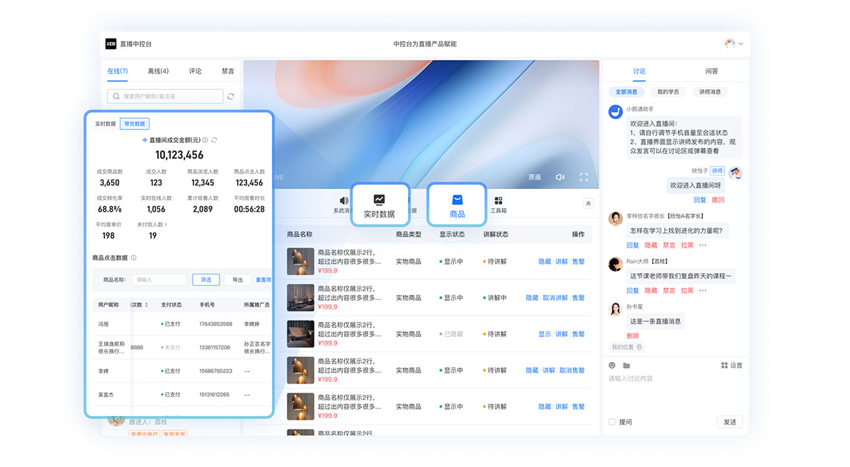 查看更加精细化的用户数据、观看数据和带货数据;运营和销售人员可在直播中控台随时查询往期直播的相关数据,不断进行直播策略优化和客户的跟进转化。