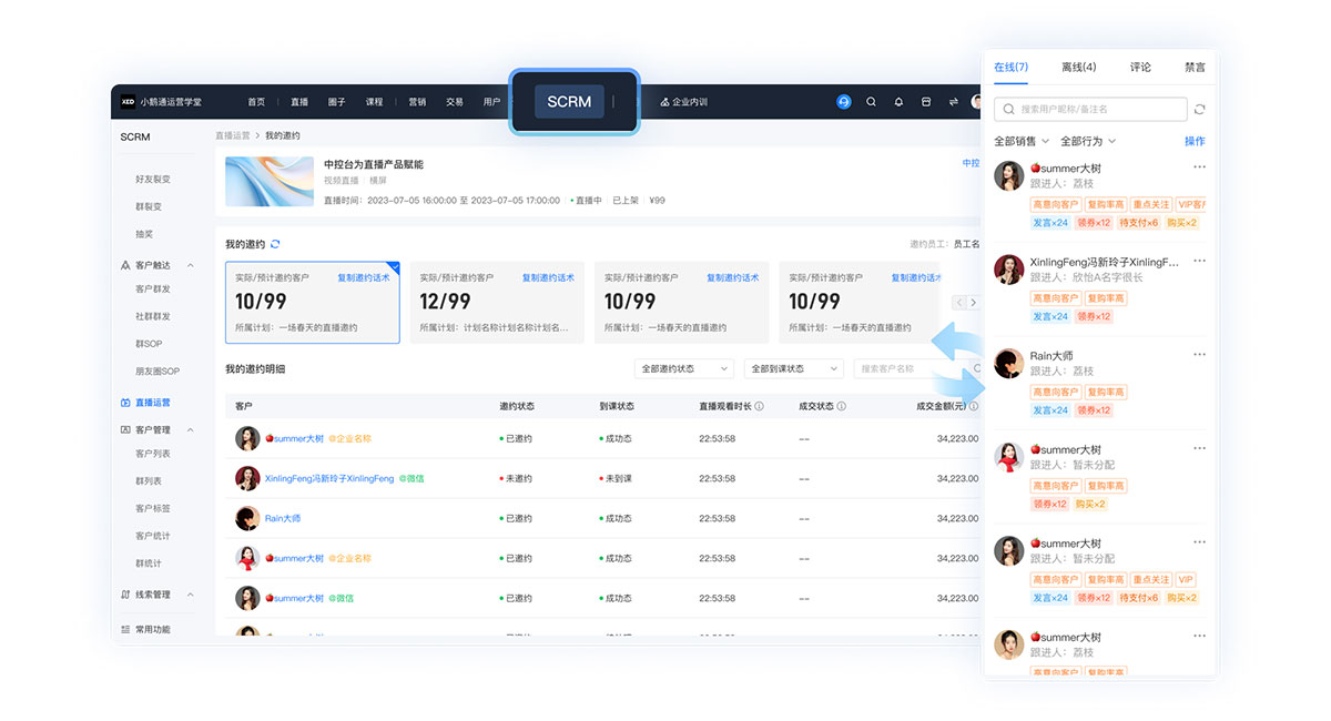 中控台与小鹅通SCRM深度结合,实现数据互通。销售可随时查看客户的在线离线情况、直播观看情况、评论互动情况和商品点击情况等数据。