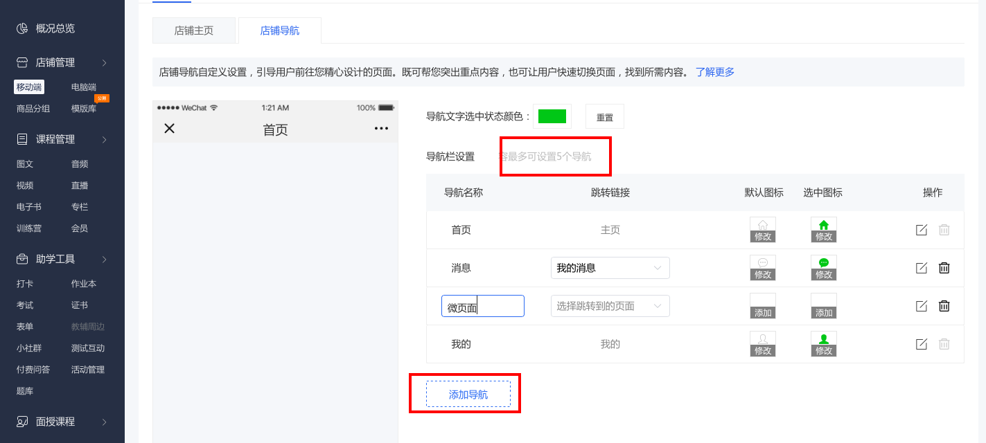 H5页面的店铺导航最多可以设置5个,小程序的店铺导航只能设置3个。