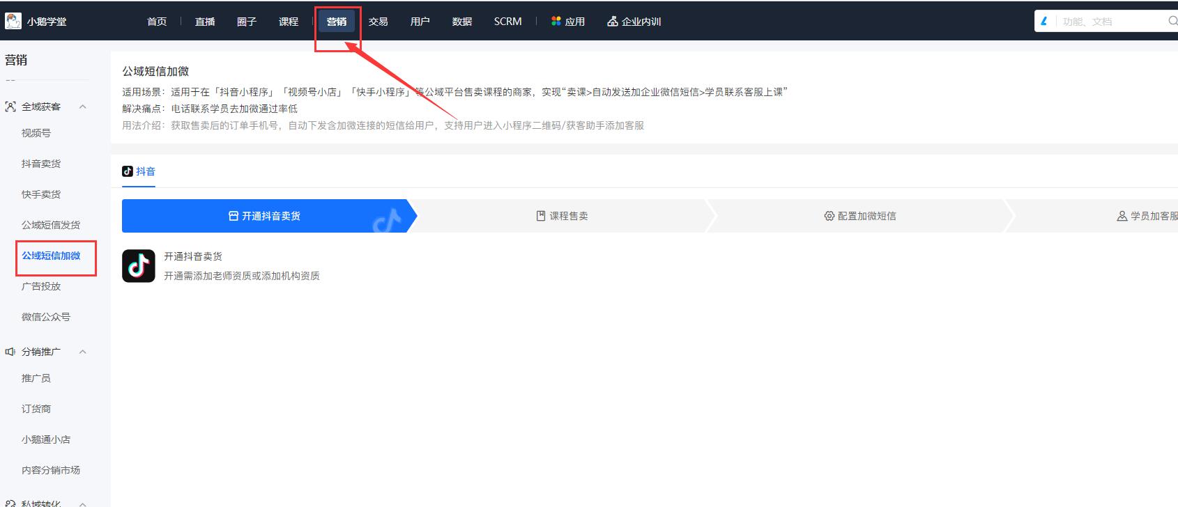 小鹅通商家用户可以登陆自己的店铺管理后台,找到“应用”——“经营渠道——“公域短信加微”,就可以按着步骤去配置抖音加微功能了,小鹅通商家用户快来体验吧。