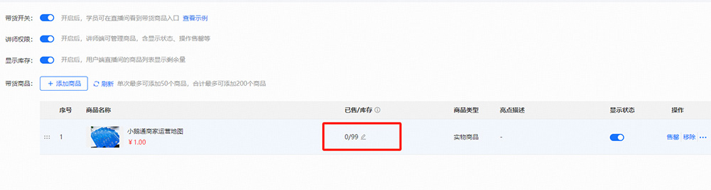 2、小鹅通直播带货管理端操作商品售罄,在直播间设置带货商品的地方就可以直接控制直播间商品售罄数量