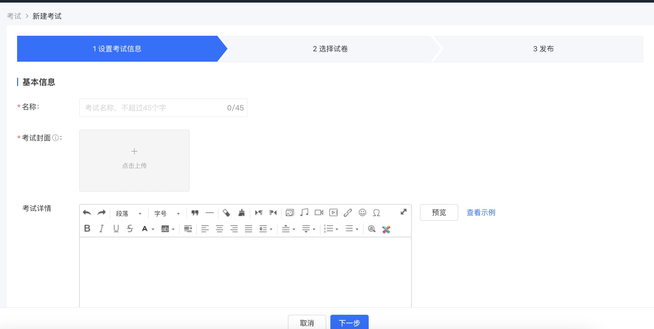 1. 进入考试功能页——点击新建考试——设置考试信息点击下一步(注*标注为必填项)