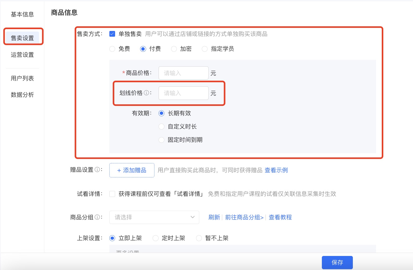 划线价格设置在【新建商品-商品信息】。商品售卖方式为【付费】时,才有划线价格,且为选填项。在商品没有其他优惠活动(如拼团)的情况下,填写后,会在商品详情页以划线形式显示。