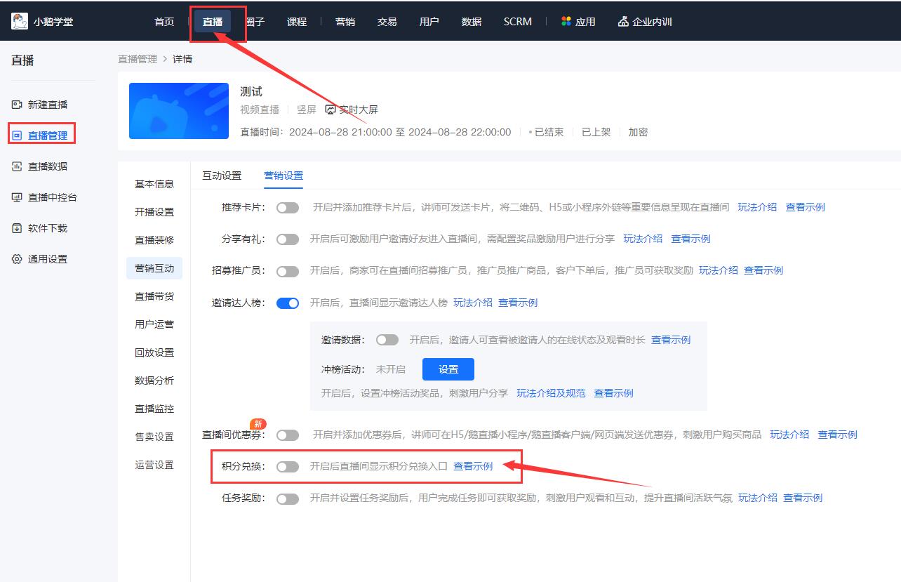 小鹅通商家用户在商家自己的小鹅通店铺管理后台里面,找到“直播”——“直播间”(要设置积分兑换的直播间)——“直播间管理”——“营销互动”——"营销设置"——“积分兑换”,开启积分兑换按钮就可以了。