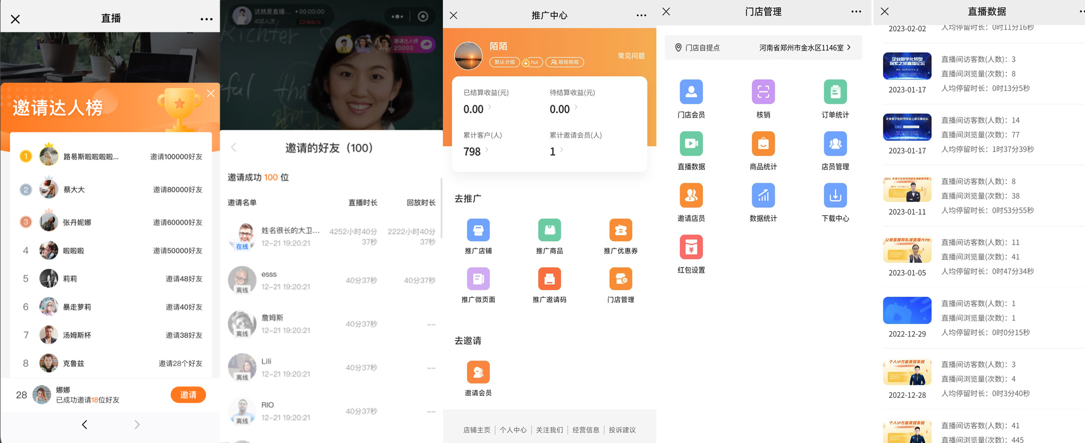 这样,在小鹅通后台数据可以导出直播观看用户所属邀请团队和所属邀请人,推广员可以在直播间的达人榜查看自己邀请的人数,店长也可以在推广员工作台-门店管理-直播数据中查看每一场直播的人数和人均观看时长