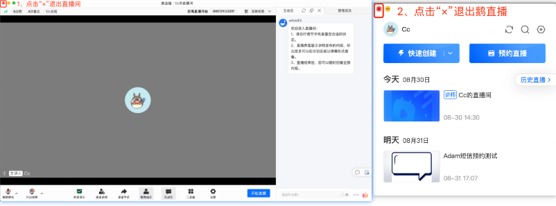 ● 退出鹅直播操作示意: