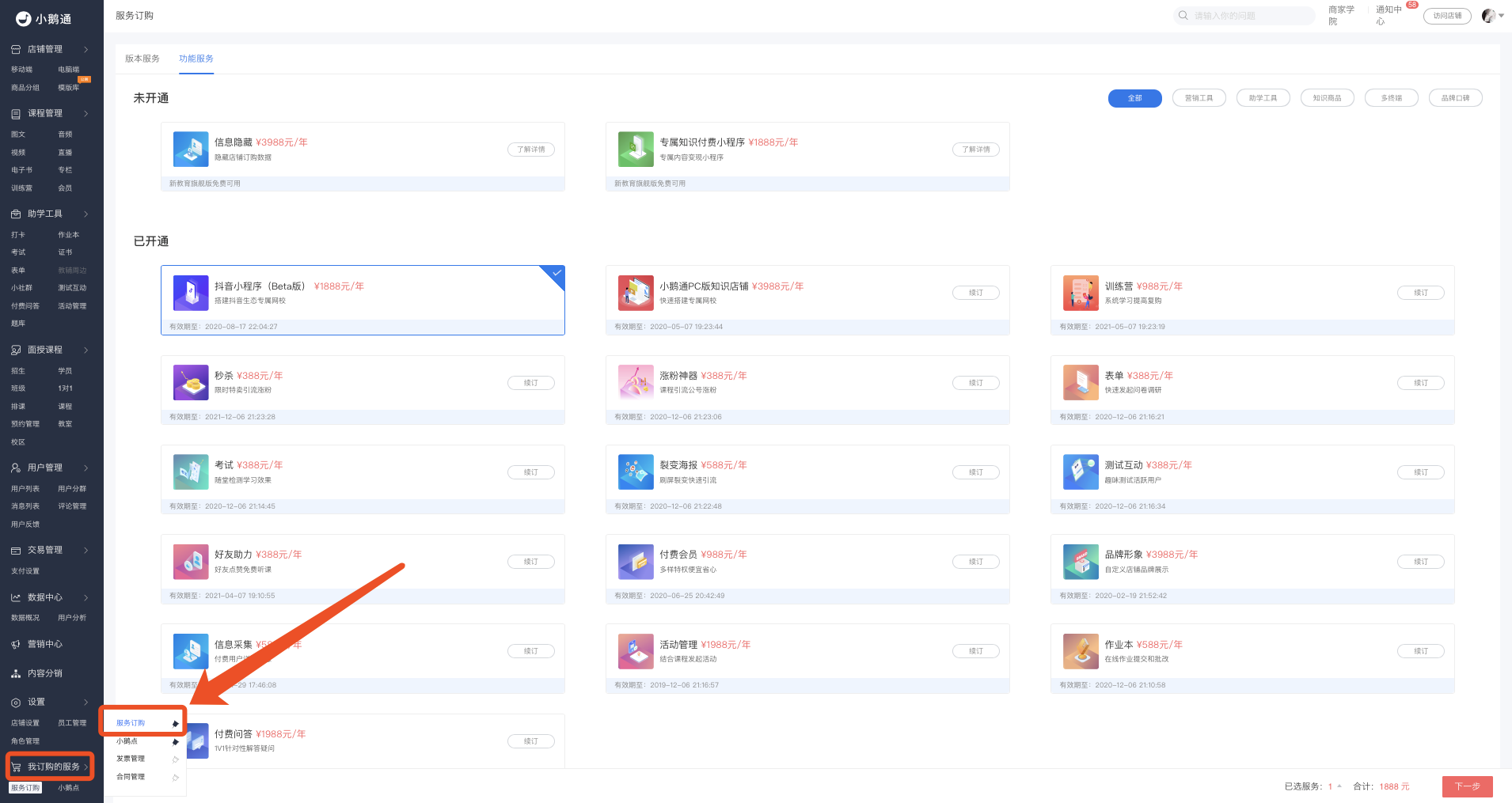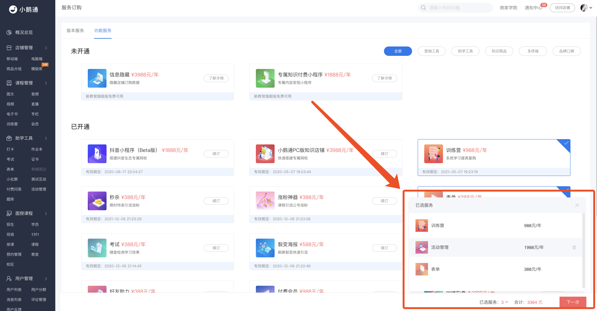 功能介绍:商家根据自己需求订购小鹅通服务的页面。