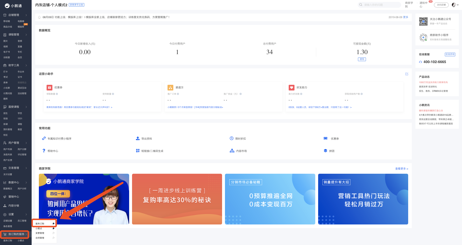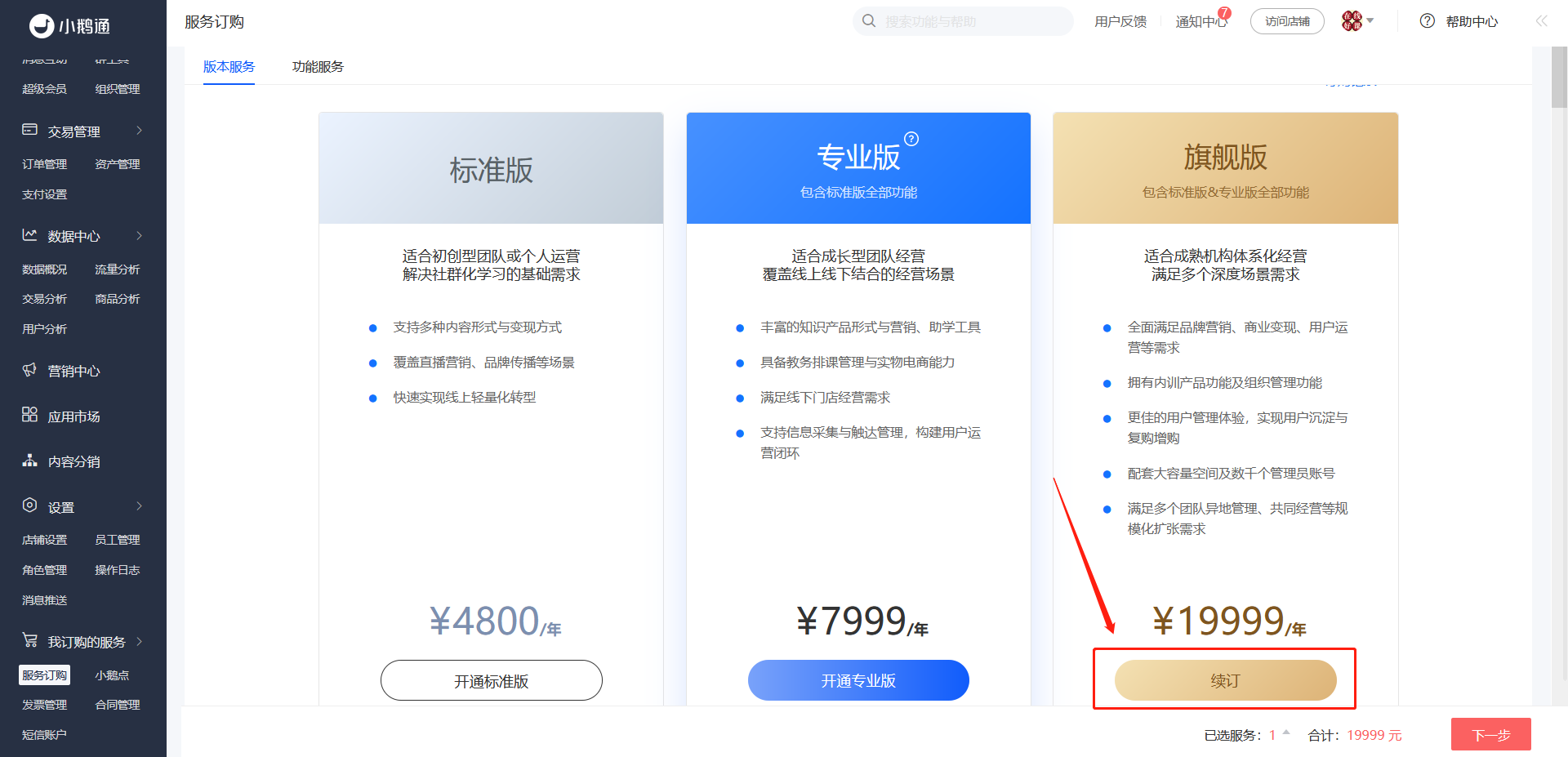 二、若您已注册小鹅通知识店铺,希望升级或续费服务: