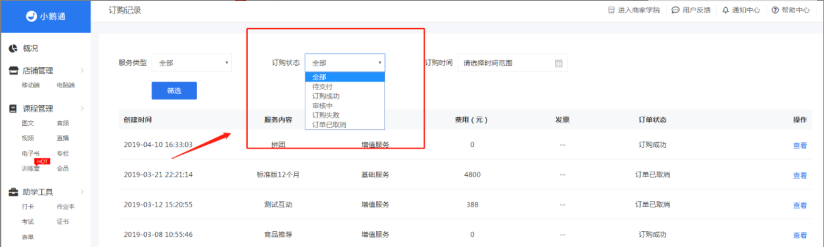 商家可在【服务类型】中选择:全部、基础服务、增值服务、组合服务4个类型来查询对应的订购记录,同时可以选择【订购状态】、【订购时间】等筛选查询条件。