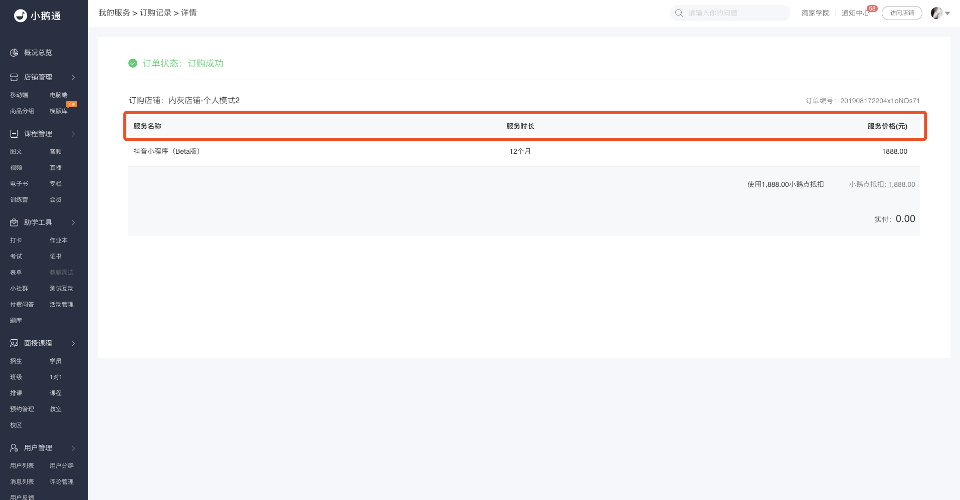 Step1:登录小鹅通后台,点击【我订购的服务】-【服务订购】进入服务订购页面。