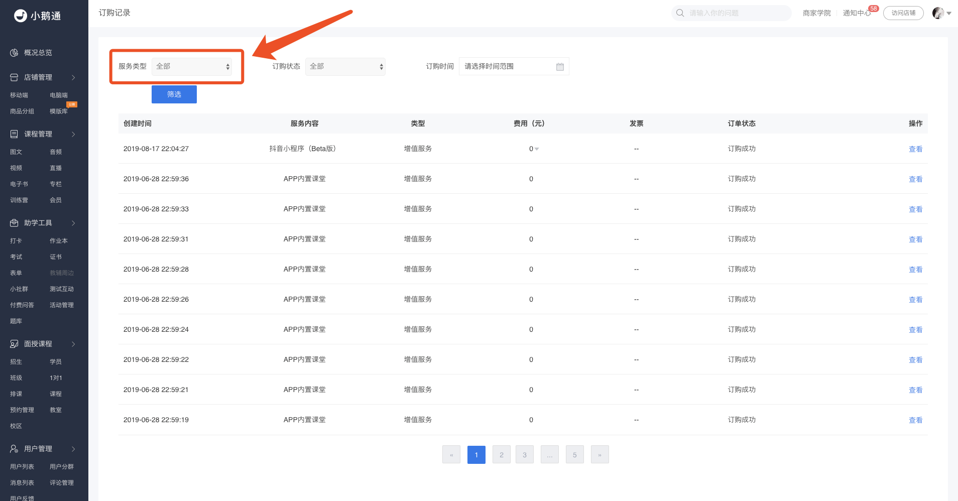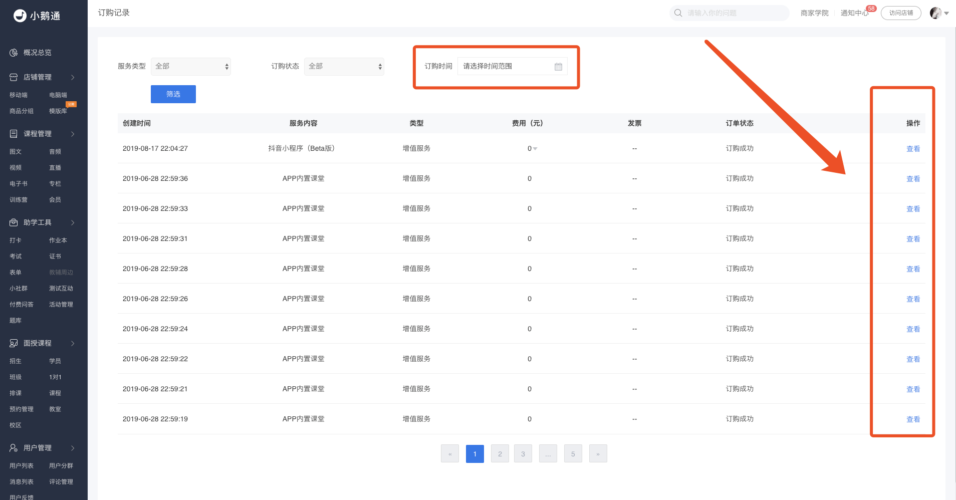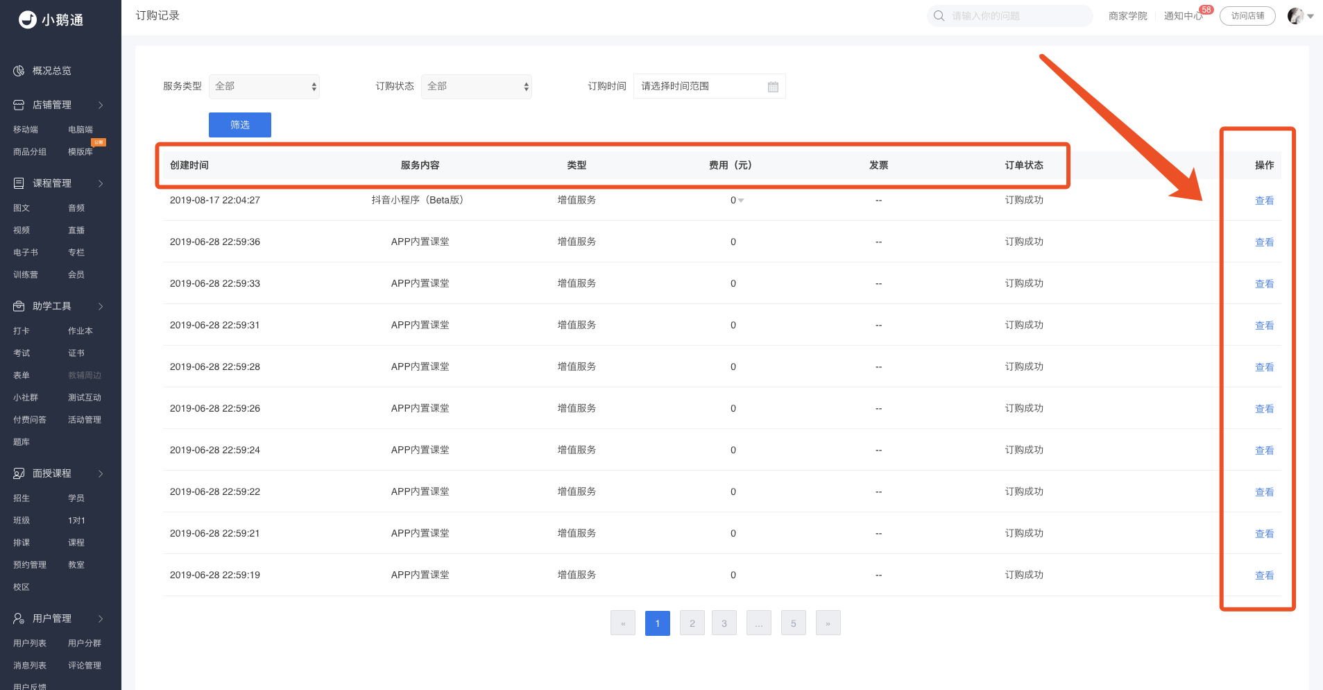 Step5:当我们按照条件筛选好订购记录之后,点击【查看】即可查看服务订购详情。