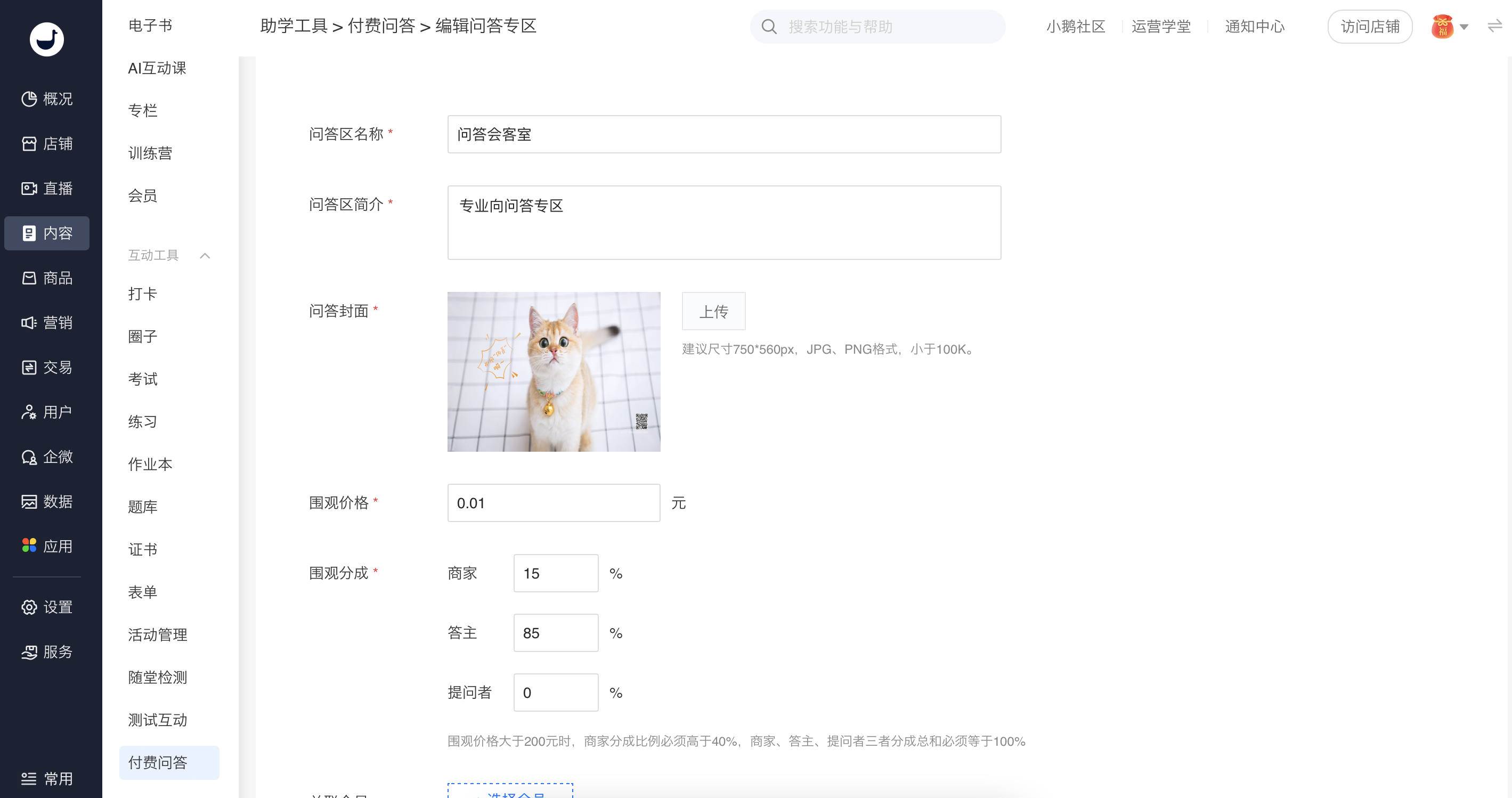 商家端:电脑管理台 →内容→ 付费问答,店铺运营者可以针对付费问答进行配置