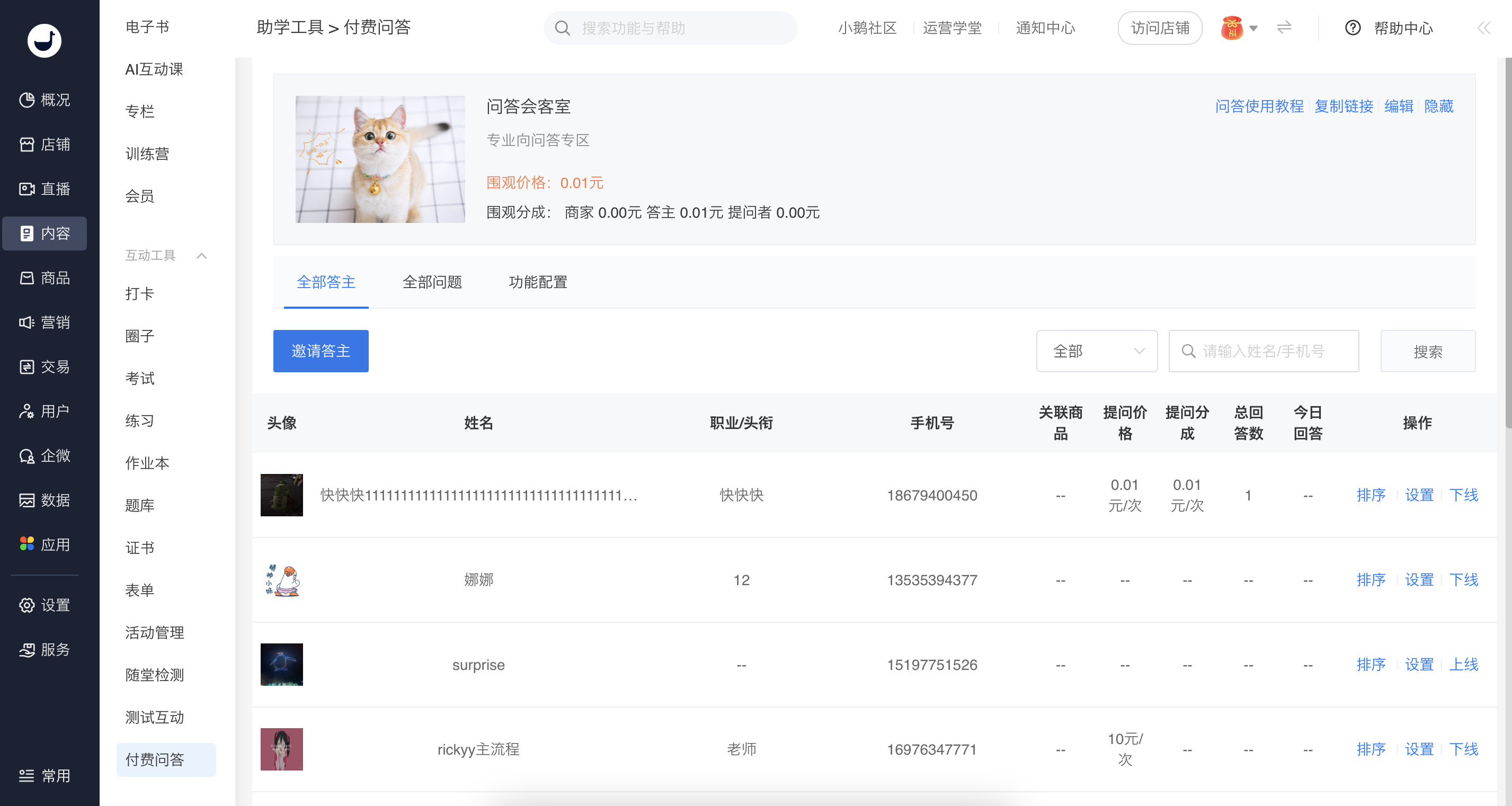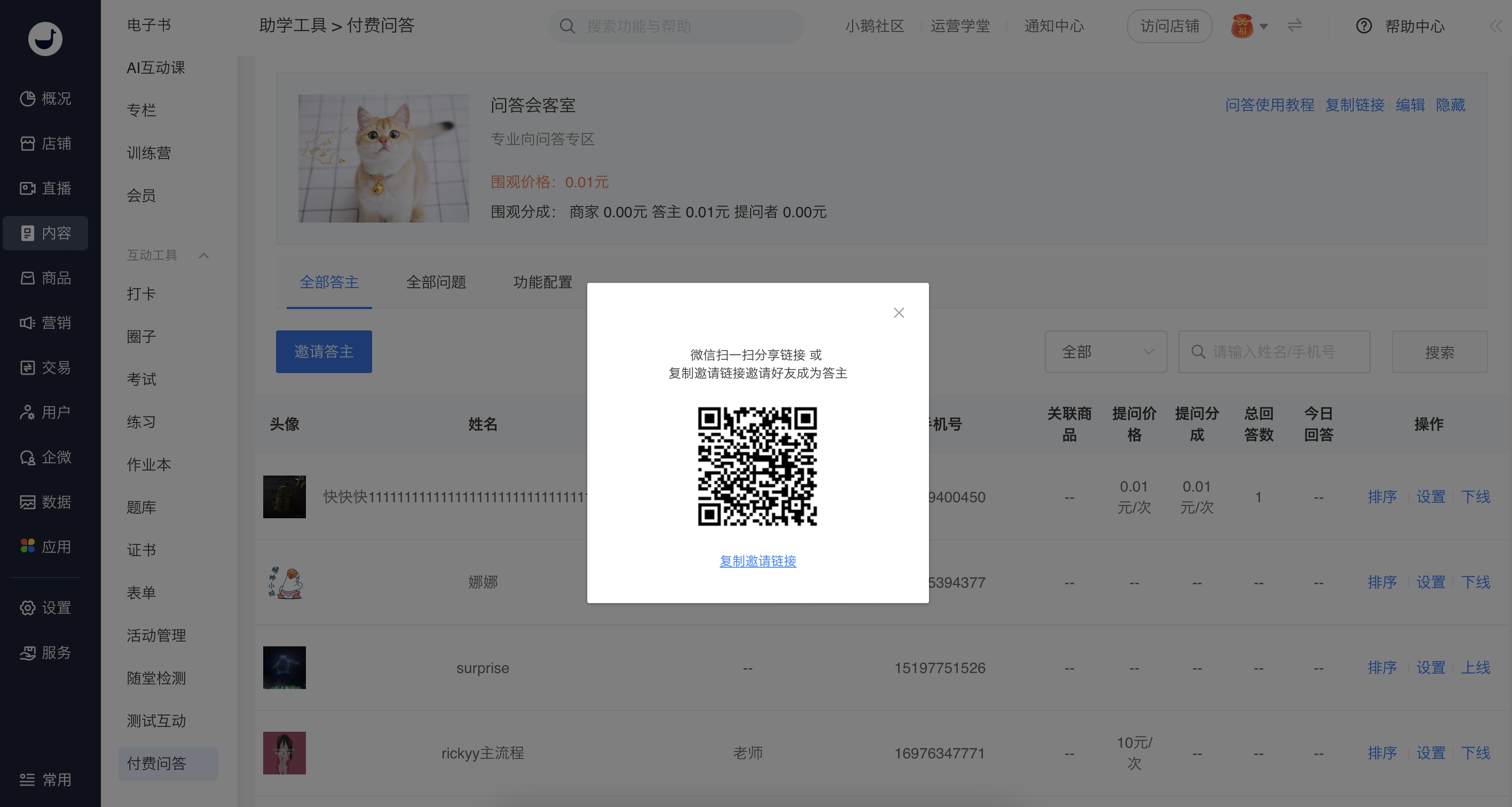 通过【邀请答主】按钮,将链接分享给好友快速邀请答主。针对每一位答主可以进行相关信息和分成的设置,并确认上线下线。