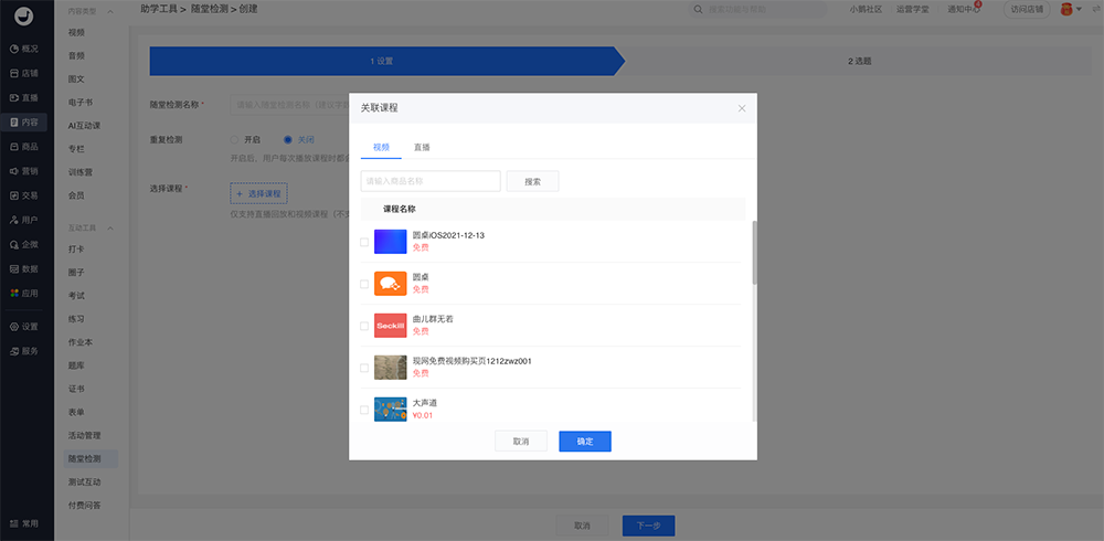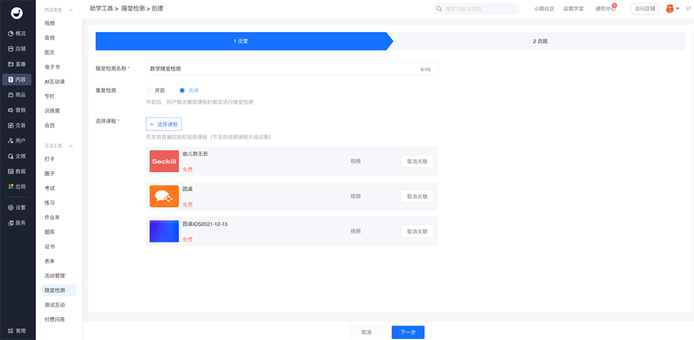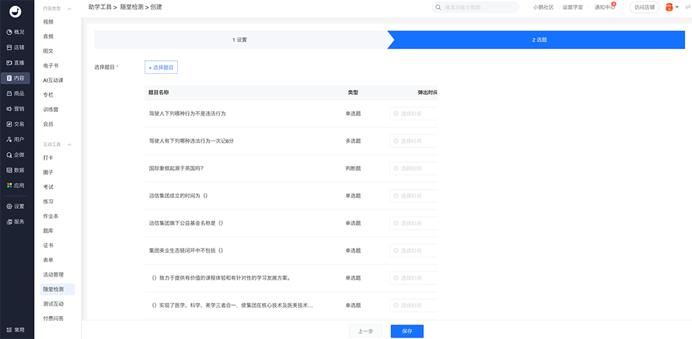 商家通过自由配置课程与题目,自由设置题目弹出时间,实现学员在课程学习过程中弹出相应的题目,从而达到随堂检测的能力以及督促学习的能力,保障了学员的学习质量。