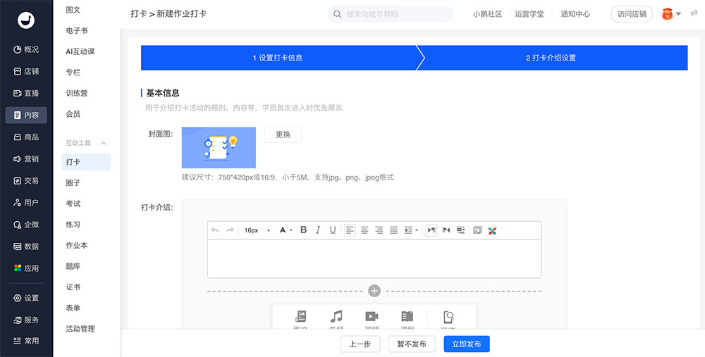 2、 更换打卡介绍封面和编辑打卡介绍内容,随后点击下方【暂不发布】或【立即发布】按钮,即可生成新的作业打卡。