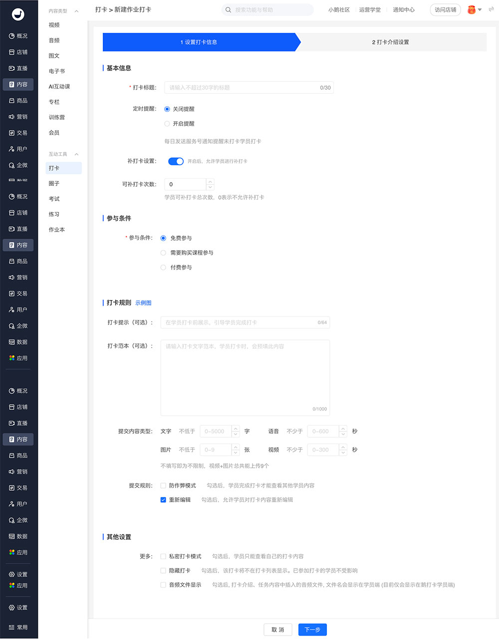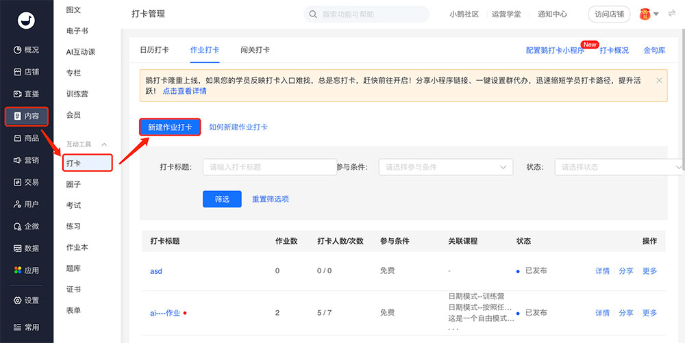 商家端:电脑端管理台 → 内容 → 打卡 → 作业打卡 → 新建作业打卡