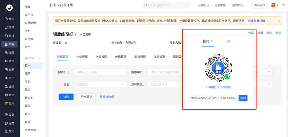 创建打卡后,点击【分享】,即可获得对应打卡的分享码及链接。