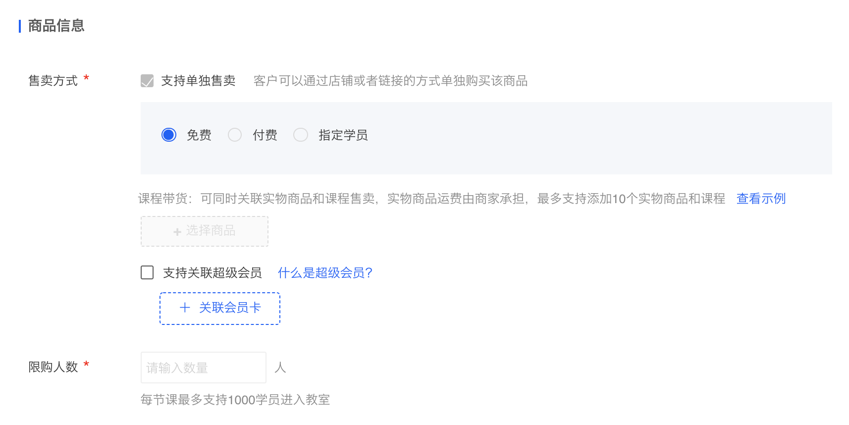 1)售卖方式:可选择付费或免费方式,以及支持关联超级会员;在选择付费后,可关联实物商品一并售卖;在选择关联超级会员后,可设置会员卡折扣权益;
