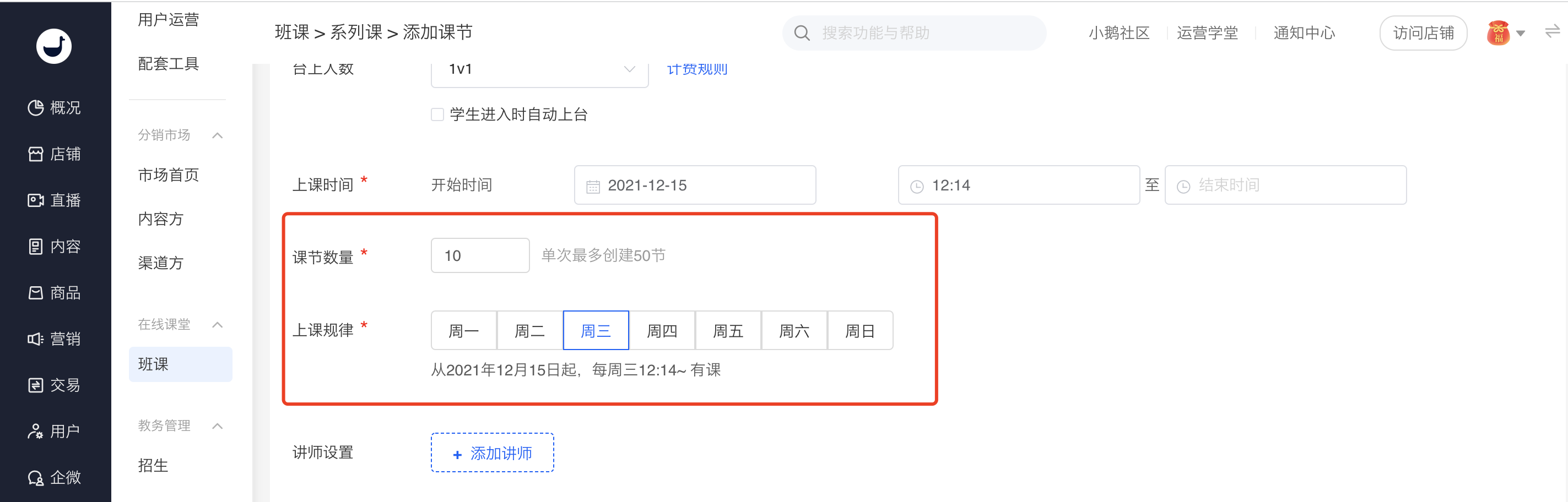 2、勾选开启批量创建课节后,可以设置批量创建课节的数量,还有上课规律选择;