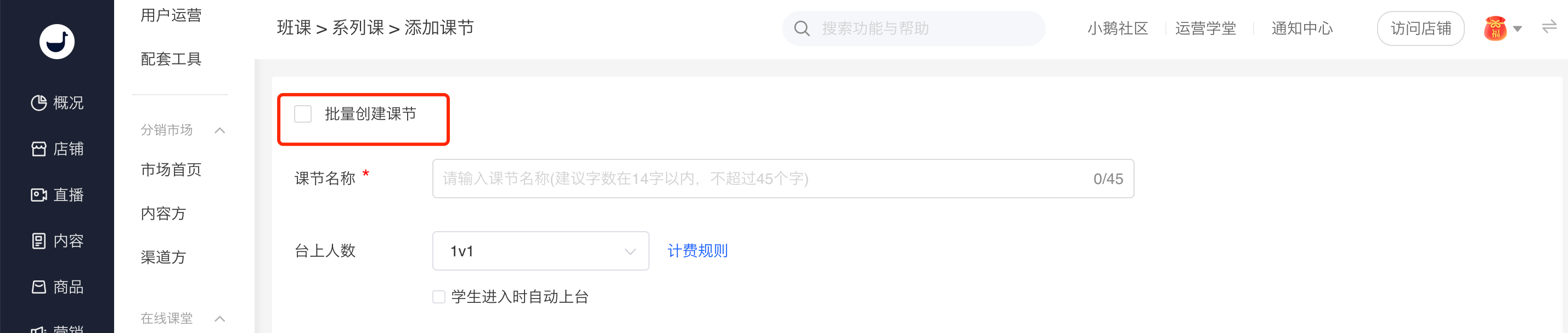 1、系列课程在添加课节时,上方会有批量添加课节的开启框;