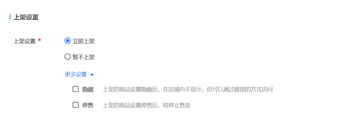 可选择立即上架或暂不上架,更多设置:隐藏或停售。