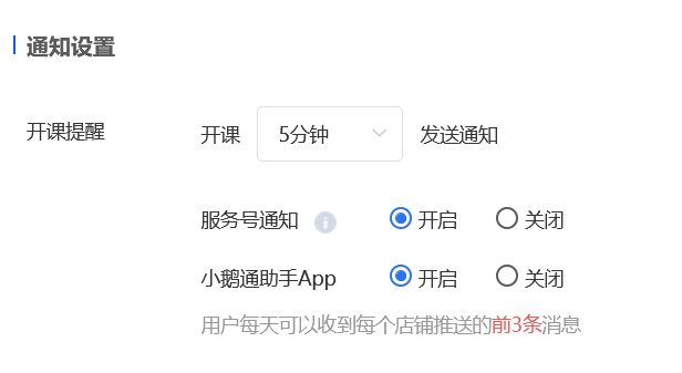 ● 回放设置:有开启和关闭二选一的勾选,默认选中关闭。选择关闭时,客户端会提示“本节课无回放可看”。
