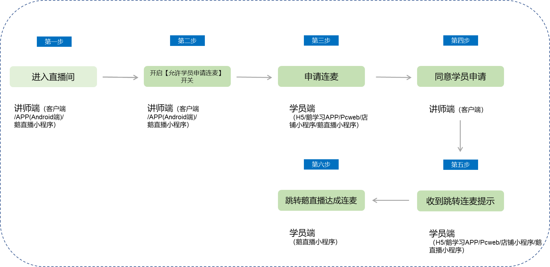 讲师端(主讲人/嘉宾):登录PC客户端 / APP端 /鹅直播小程序 → 进入直播间 → 上下麦 → 直播互动