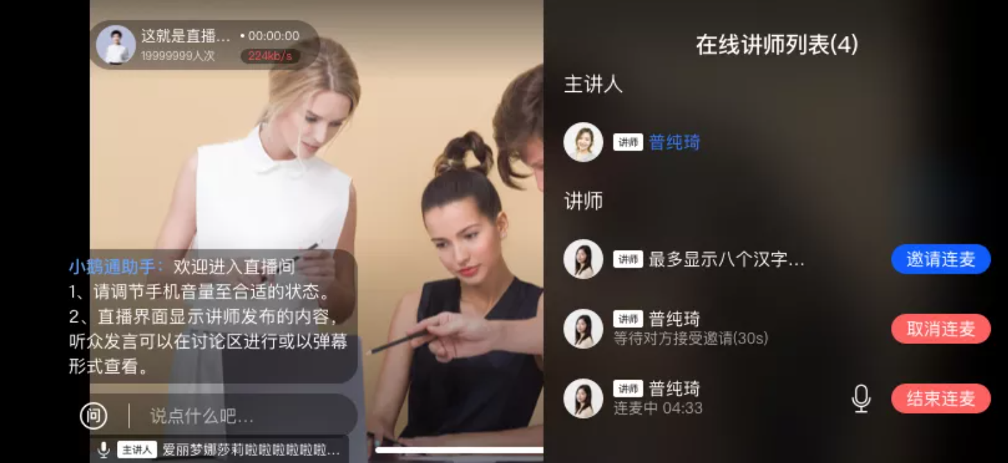 满足商家在直播过程中讲师之间连麦讨论话题或深度汇谈的场景。