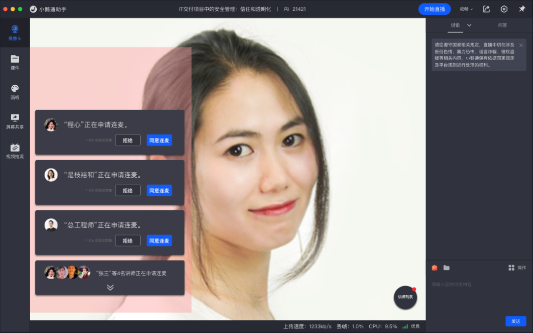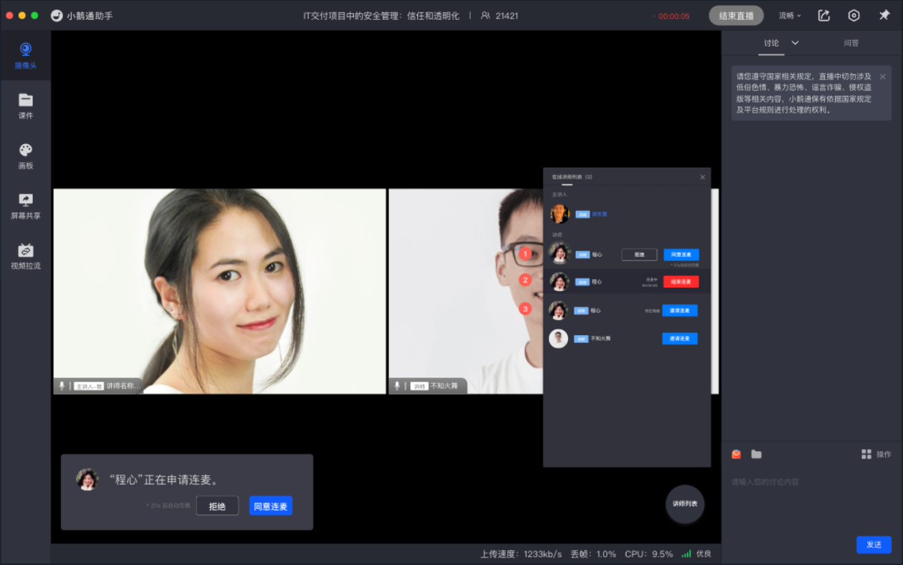横屏直播新增圆桌会议模式,支持讲师和多名嘉宾同屏、连麦互动,满足更多直播场景,提升直播效果。