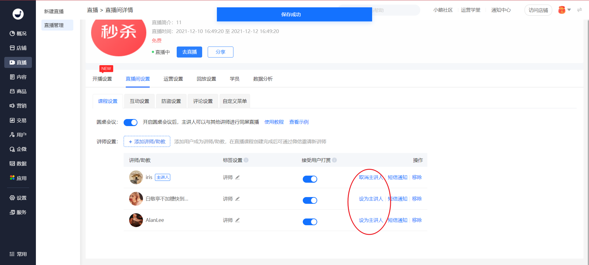 添加完讲师后,在已添加讲师列表中选择1位成为直播主讲人,其余讲师自动变为嘉宾。目前最多支持设置5位嘉宾上台。