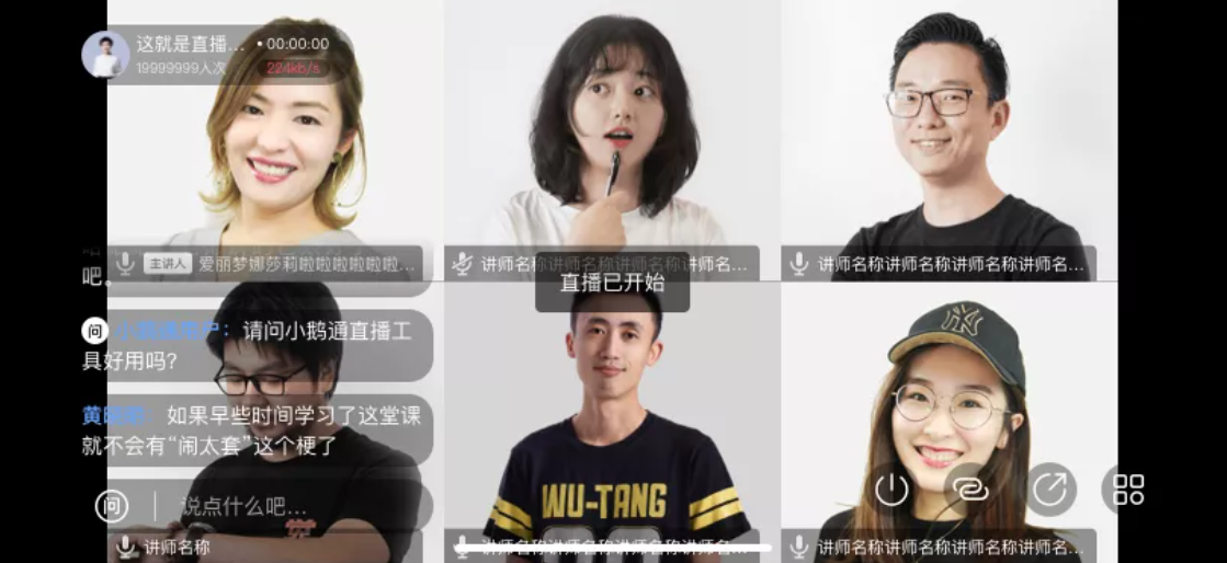 3、讲师之间做好课前沟通,主讲人可以点击【开始直播】,此时学员端可以看到直播间画面,主讲人和嘉宾开始直播和互动操作。