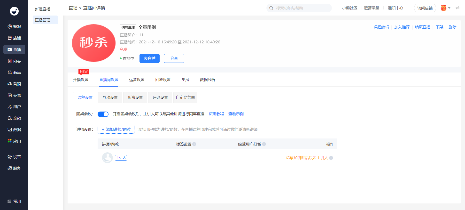 商家端:商家后台 → 直播间详情 → 课程设置 → 圆桌会议模式