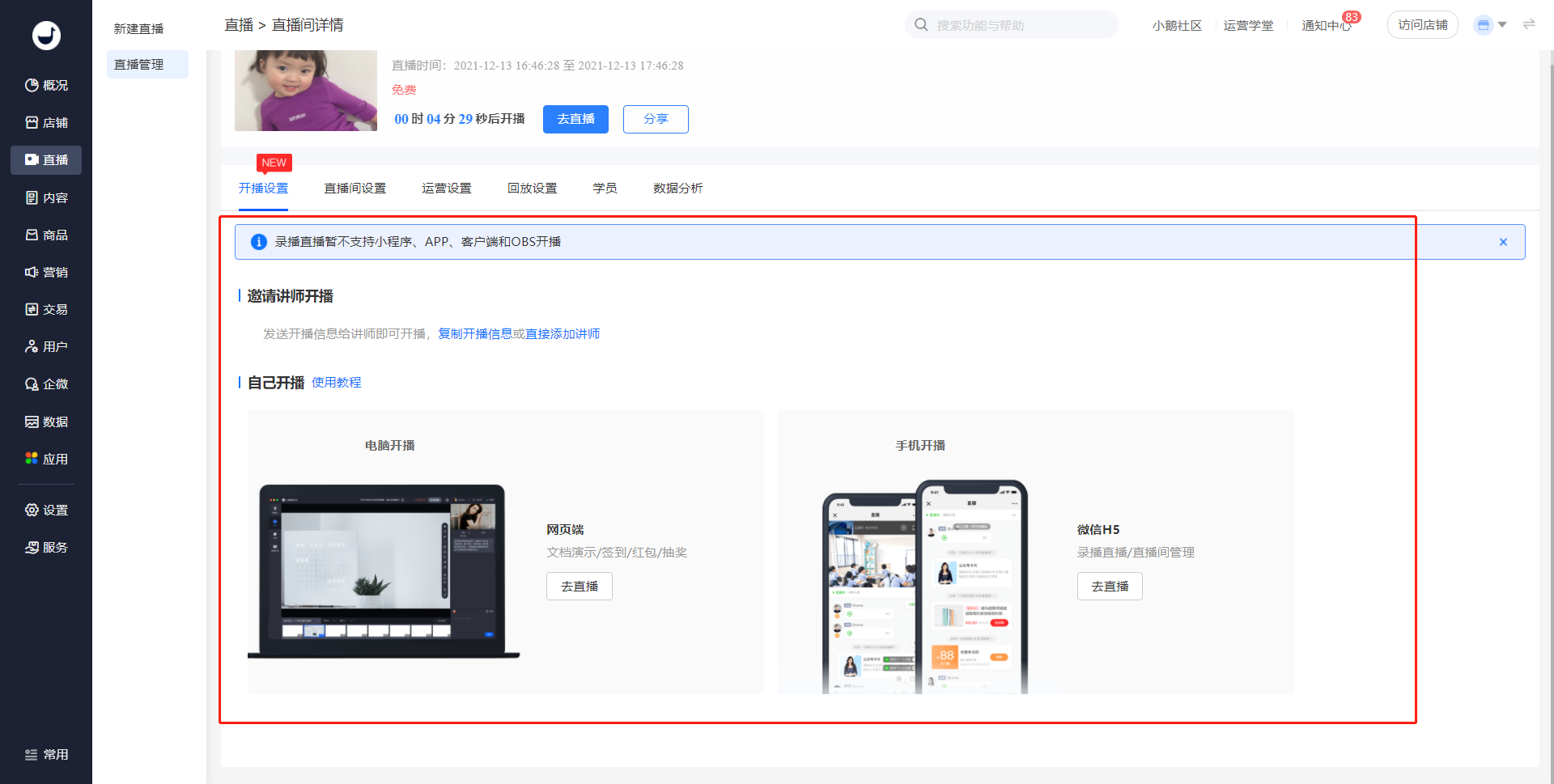 小鹅通支持 3 大类直播类型:分别是视频直播、语音直播、录播直播,其中视频直播分为【横屏直播】与【竖屏直播】两种直播模式。