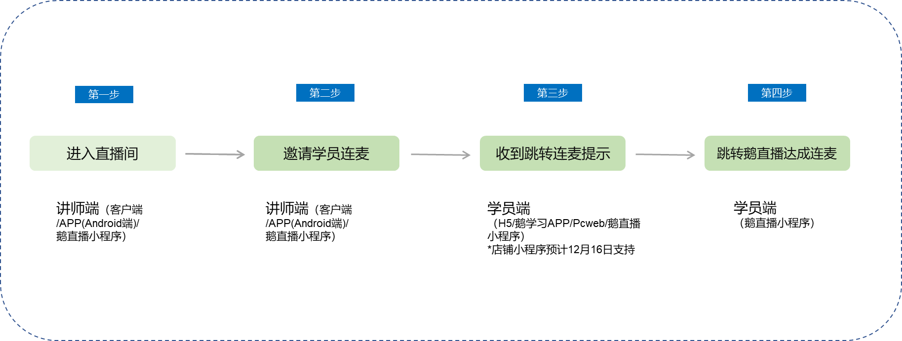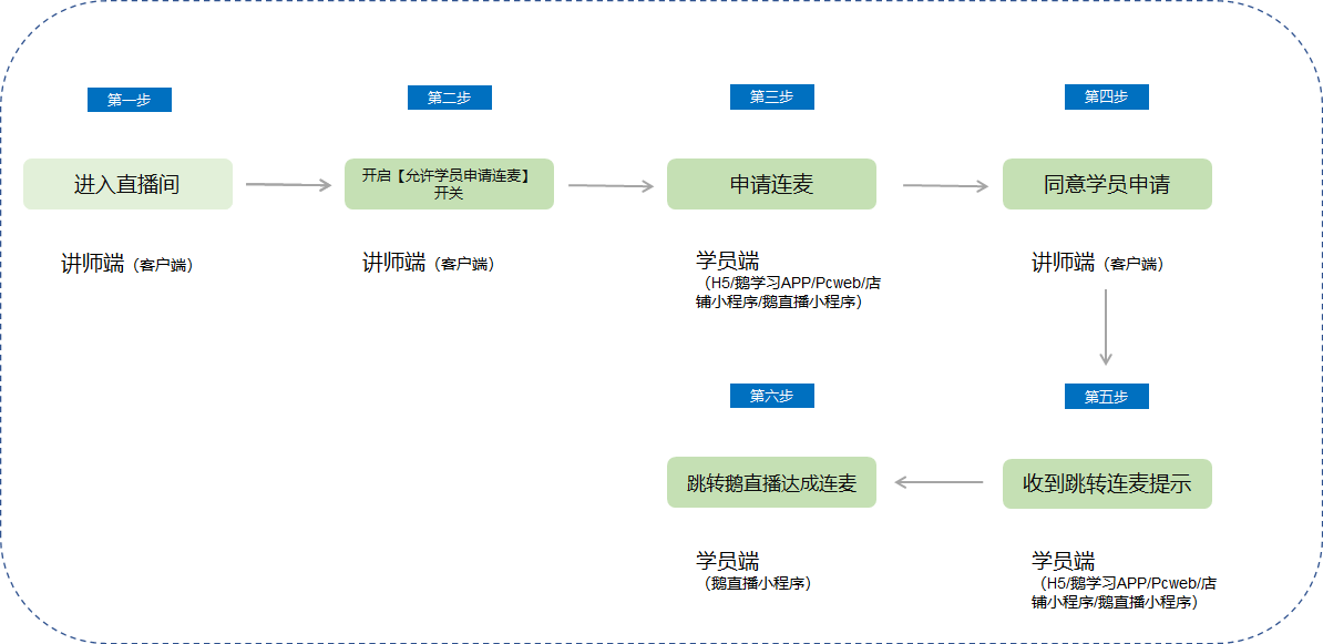 讲师端:登录PC客户端 / APP端(10月中旬支持) → 进入直播间 → 邀请学员连麦/开启允许学员申请连麦开关