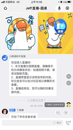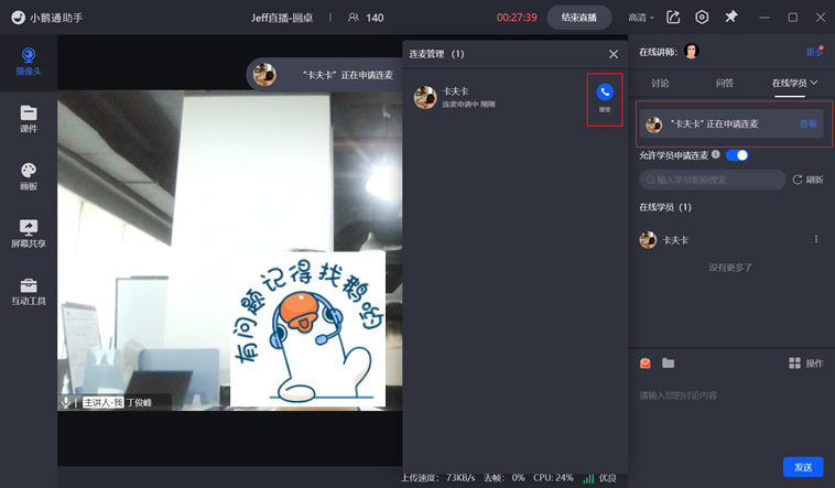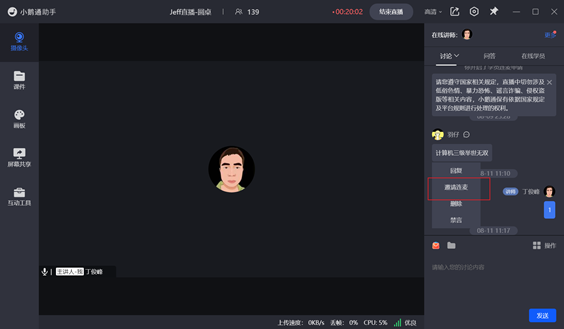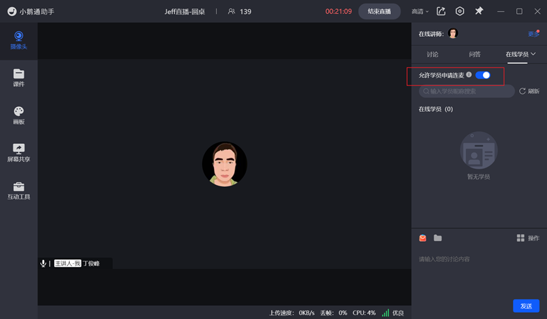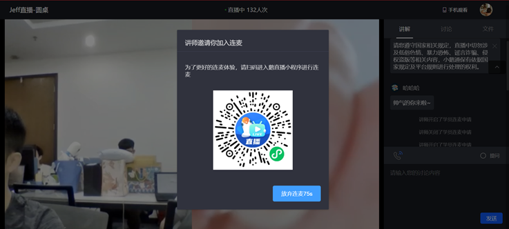 【互动讨论】当讲师抛出一个话题后可开启【允许学员申请连麦】开关,鼓励有讨论欲望的学员申请上麦并接通从而达到互动讨论的效果,增强学员在直播间内的参与感。