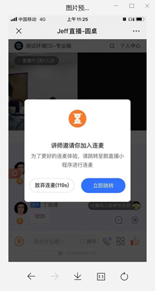 第五步 学员收到跳转连麦提示(H5/鹅学习APP/Pcweb/店铺小程序/鹅直播小程序)